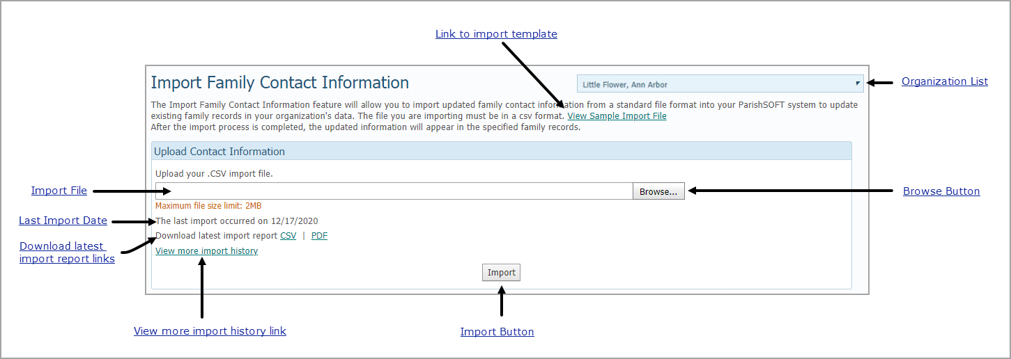 The Import Family Contact Information page allows you to import files from external applications to update member contact information in your database.