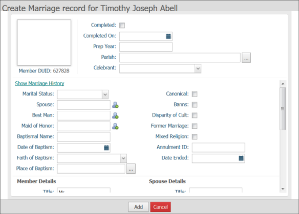 The Member Details area is pre-populated with the member's name details pulled from the member's record. The Spouse Details section lets you add spouse information into the marriage record.