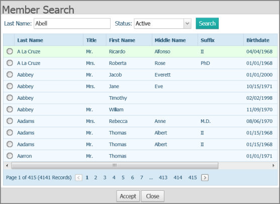 The Member Search window opens. The name of the member you are searching for is displayed in the Last Name field at the top of the window, as shown in this illustration:
