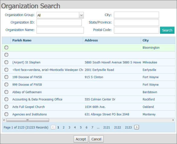 One or more organizations matching your search criteria are displayed at the bottom of the window.